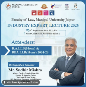 | Manipal University Jaipur hosted an Expert Lecture and the Inaugural International Law Summit on 4 September 2025, featuring Mr. Sudhir Mishra as Chief Guest and distinguished speaker. | 4th September 2025 |